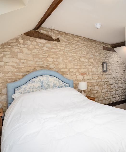 Stone barn walls and rustic beams bring character to the second bedroom. The bedroom offers ample space and comfort, featuring a double bed and private ensuite bathroom.