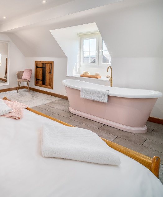 What makes the Old Dairy really special is the spacious bedroom with a grand wooden sleigh king-size bed and luxurious roll top bath.