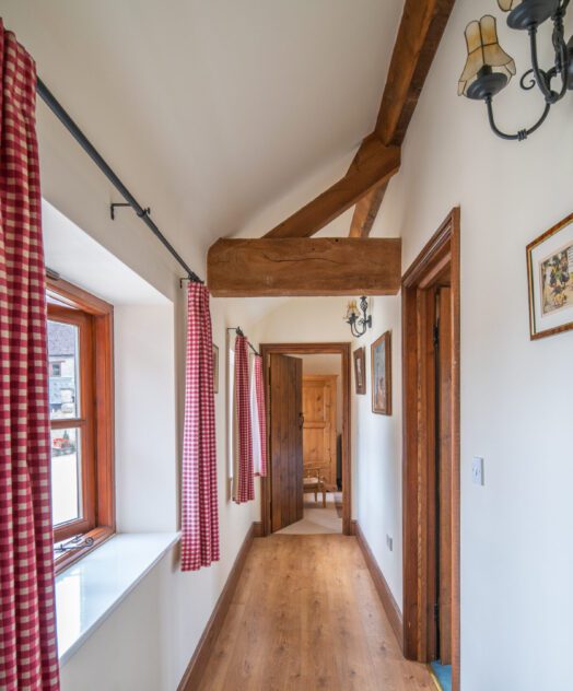 Our largest cottage is a spacious single storey stone, brick and timber barn conversion that sleeps six to eight. There are three double/twin bedrooms, two of which are en-suite, a family bathroom and hallway leading to an open-plan kitchen/living area. The facilities in this cottage include a dishwasher, microwave, toaster, fridge freezer, TV, hair dryer, iron and ironing board.